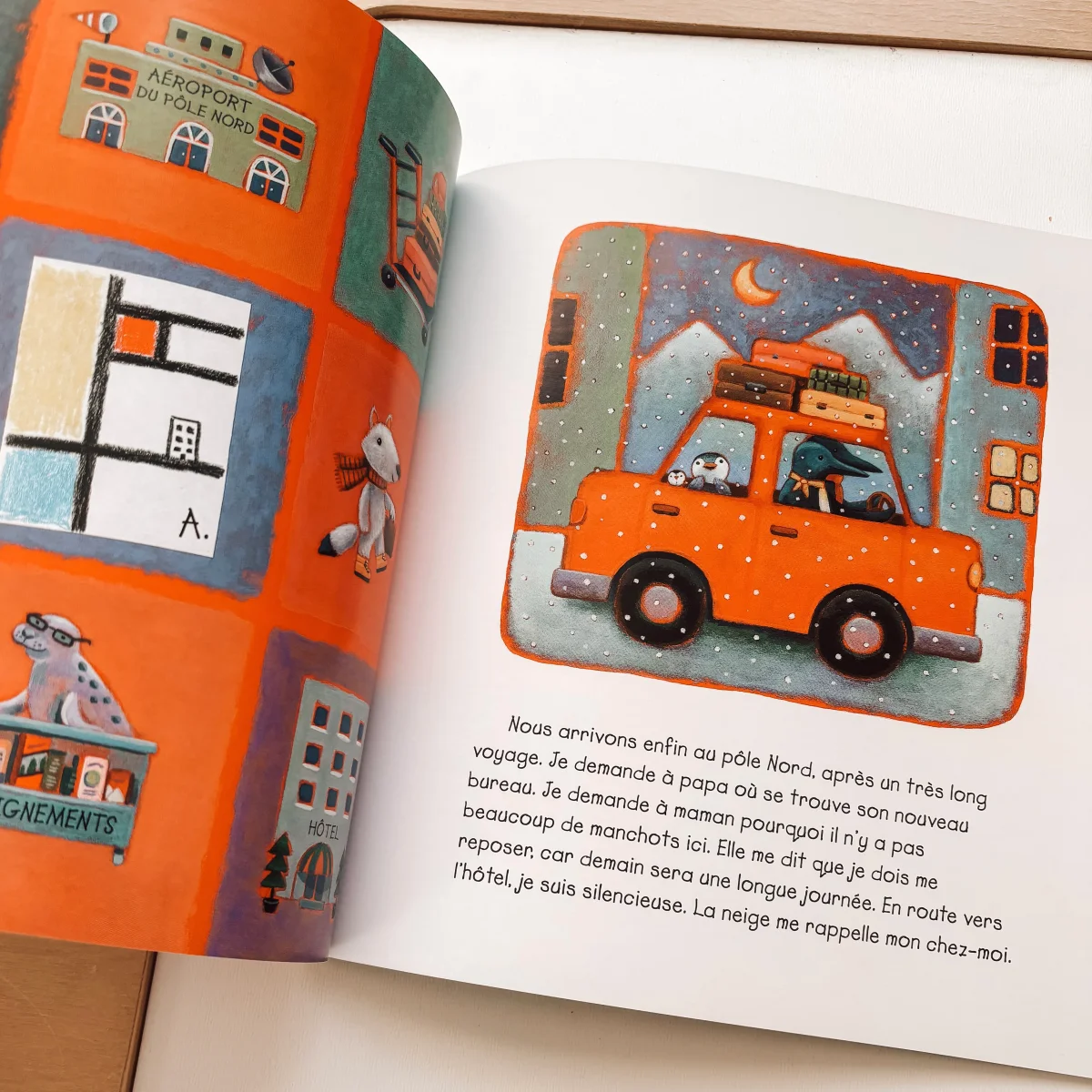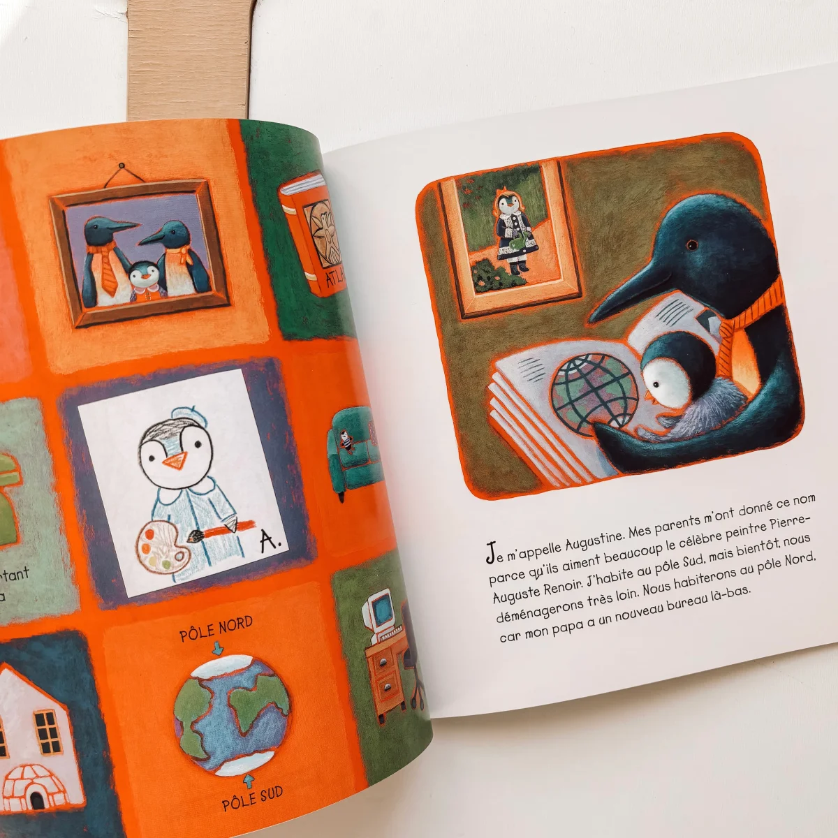 Cet album jeunesse raconte l’histoire d’Augustine, un petit manchot au grand talent artistique qui doit quitter le pôle Sud avec sa famille pour s’installer au pôle Nord. Ce déménagement lui fait peur, surtout l’idée de rencontrer ses nouveaux camarades de classe. Heureusement, son amour pour le dessin devient un formidable outil pour créer des liens et se sentir chez elle.