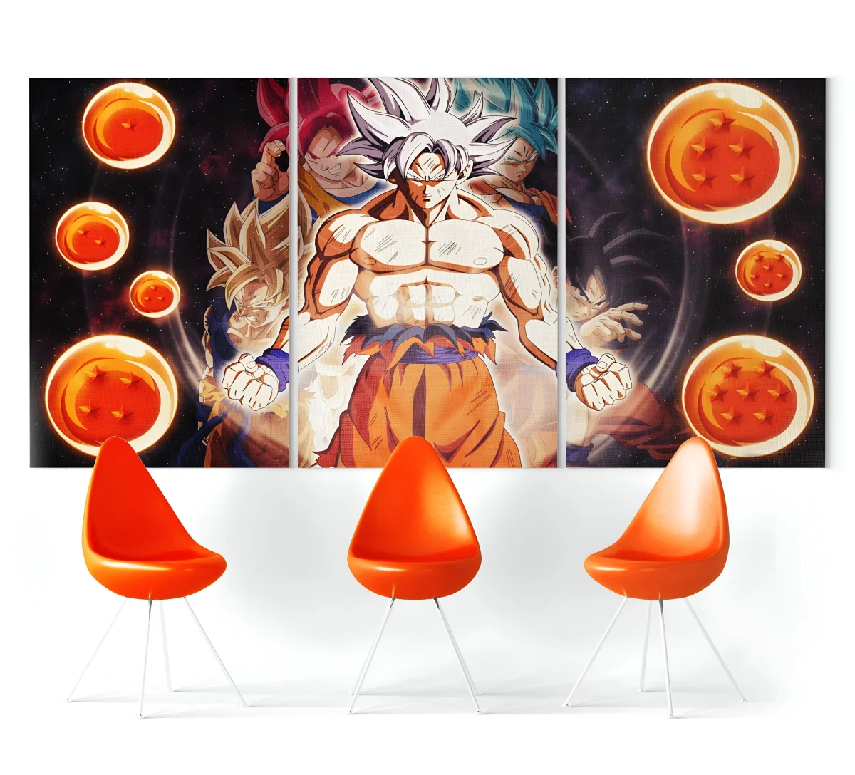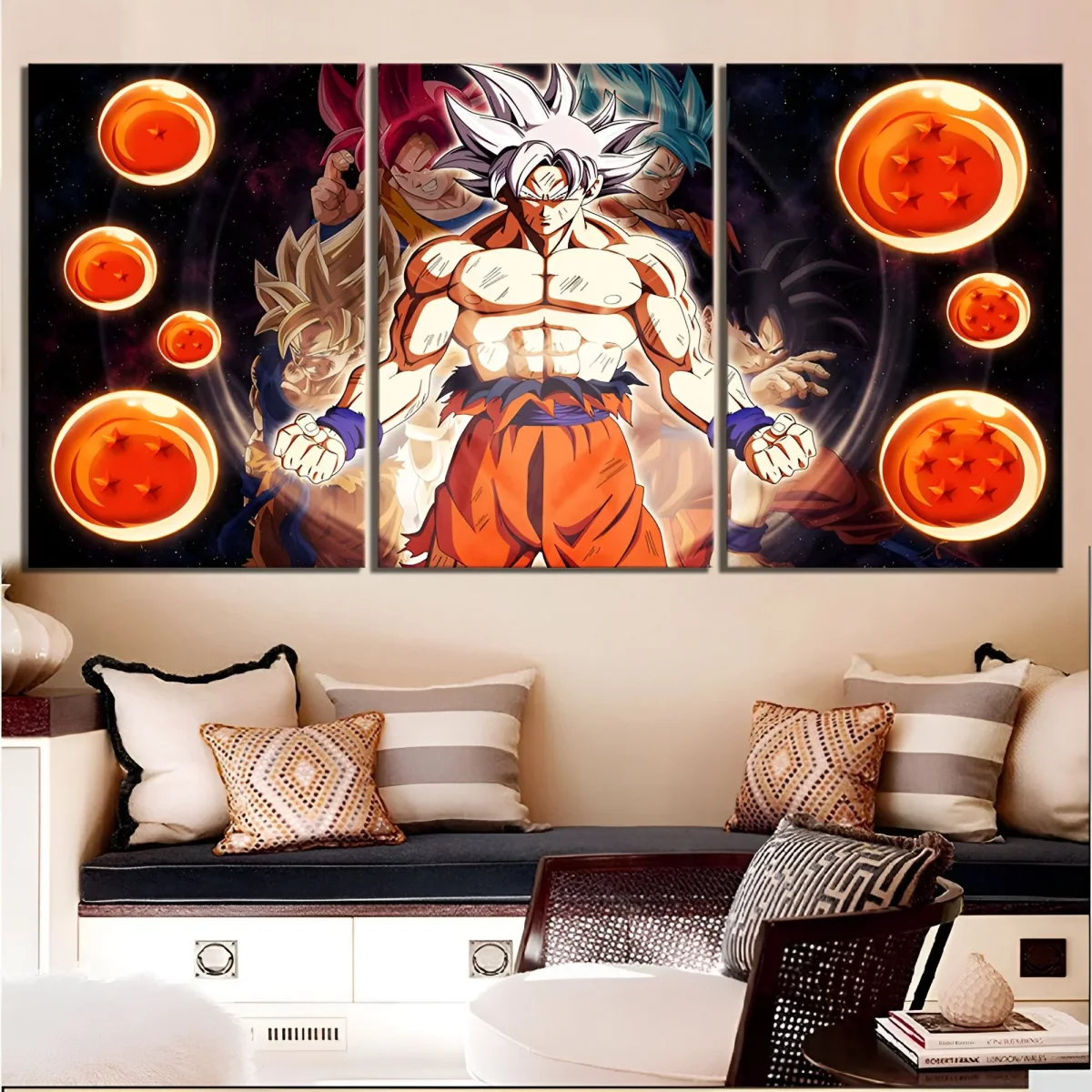 La disposition en triptyque de ce tableau permet une immersion totale dans l’univers de Dragon Ball Super. Chaque panneau est pensé pour s’intégrer harmonieusement aux autres, créant une image continue qui met en valeur l’aspect imposant de Goku. Cette structure modulable offre une certaine flexibilité dans la manière de disposer le tableau, que ce soit dans un salon, une chambre ou un bureau. La présence des Dragon Balls sur chaque panneau renforce l’idée d’un ensemble cohérent et dynamique.