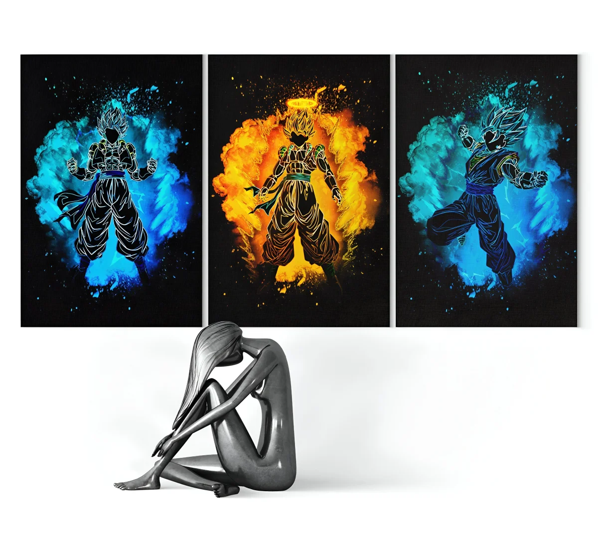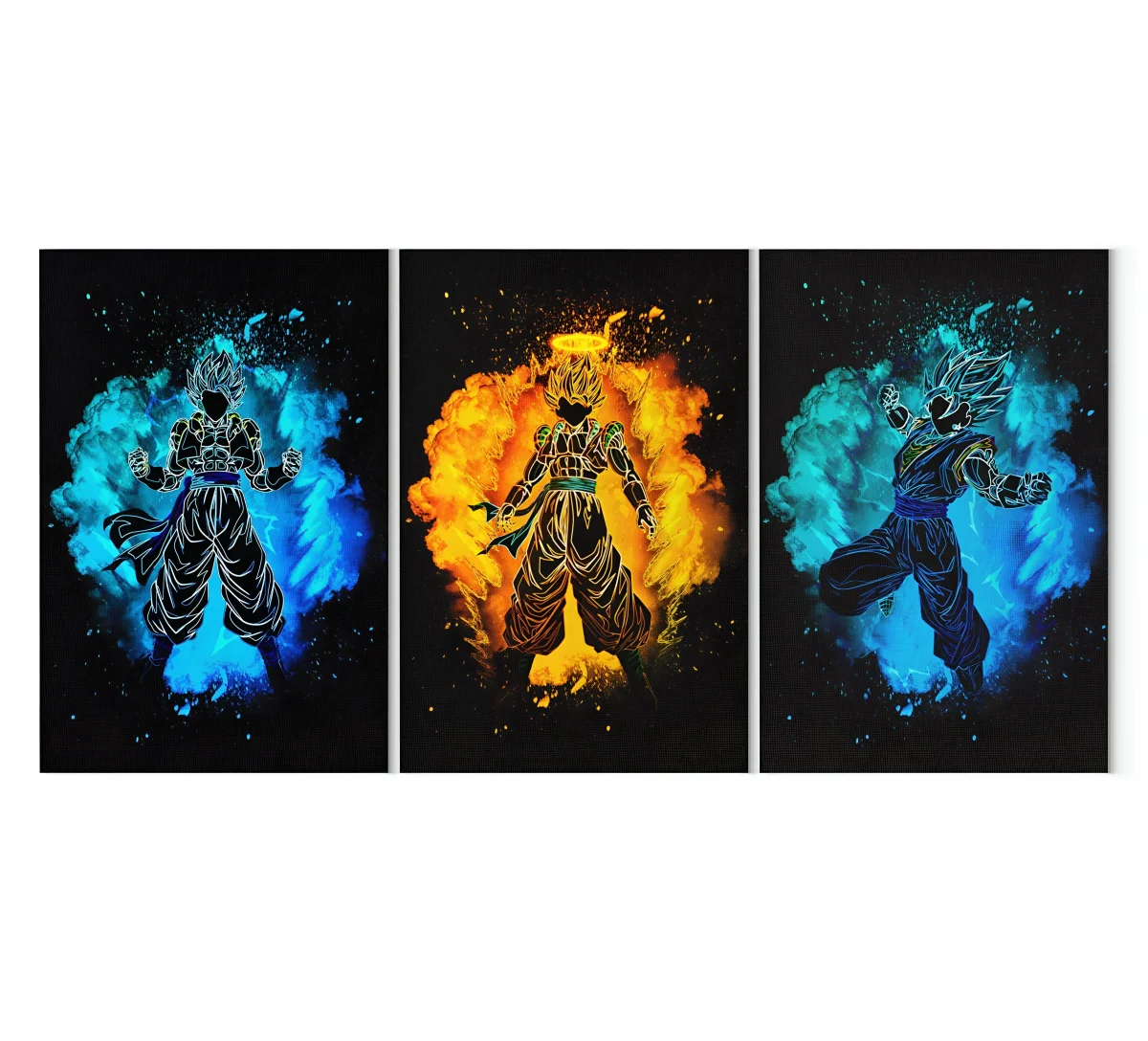 La disposition des personnages sur le triptyque souligne l’évolution de la fusion. D’un côté, Goku, la volonté, la force brute et d’un autre, Vegeta, la fierté, la stratégie. Au centre, l’entité qui naît de leur union, une combinaison de leurs forces et de leurs personnalités. L’ensemble crée une dynamique captivante et une narration visuelle puissante. C’est un hommage vibrant à l’une des transformations les plus emblématiques de Dragon Ball.