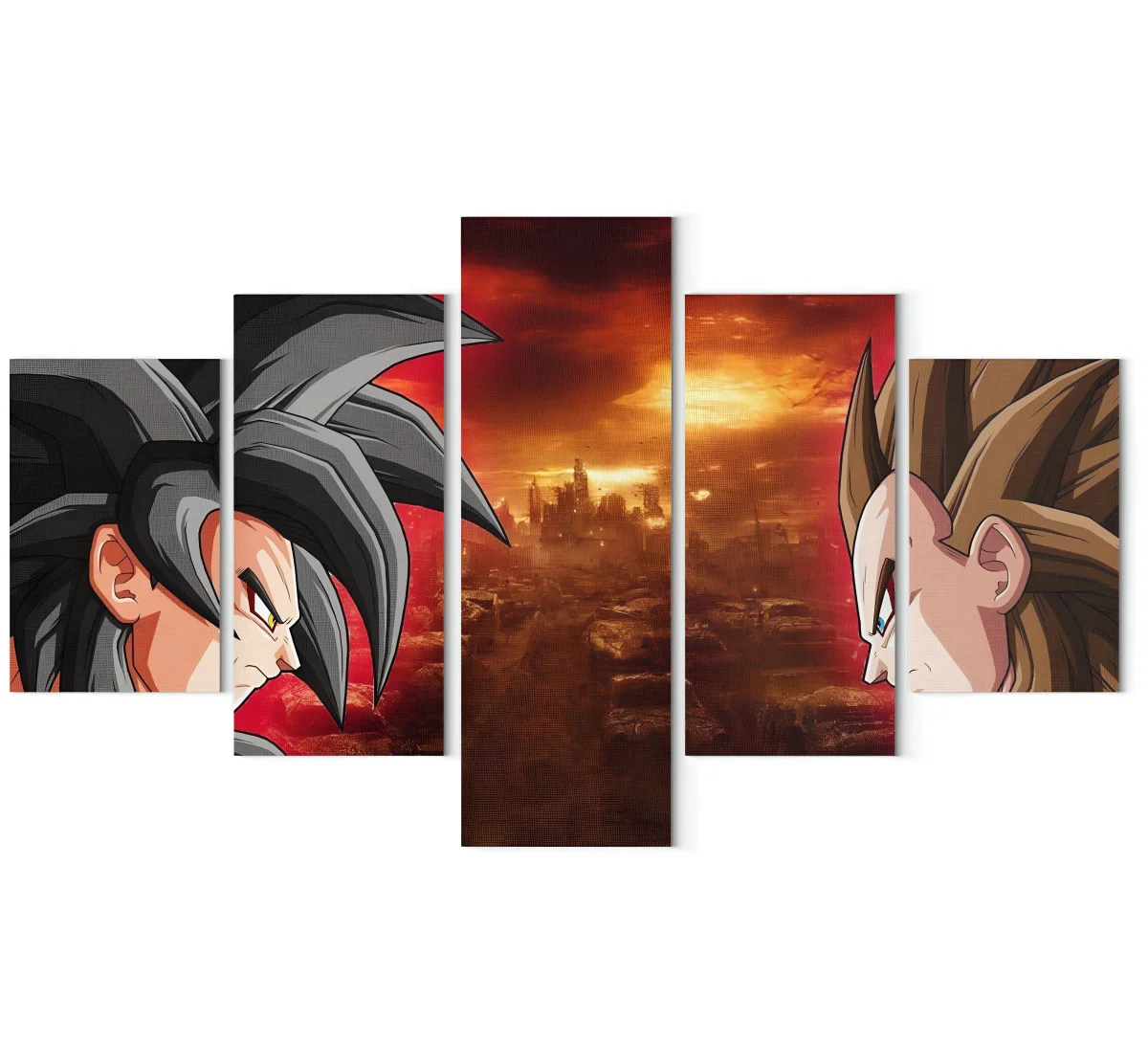 La disposition des cinq panneaux crée une composition dynamique, donnant l’impression que les protagonistes s’affrontent sur plusieurs plans. Cette approche offre une perspective inédite sur leur rivalité. Ce tableau n’est pas seulement une représentation, il est une invitation à revivre l’intensité des combats et la profondeur des liens entre Goku et Vegeta, des adversaires devenus compagnons d’armes au fil des épreuves.