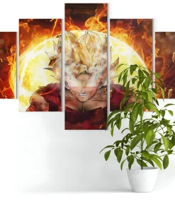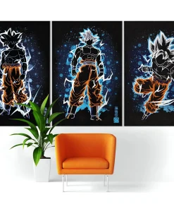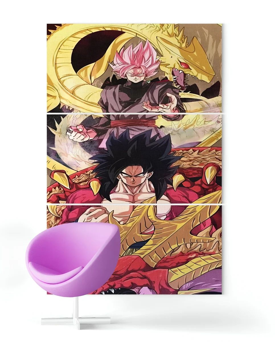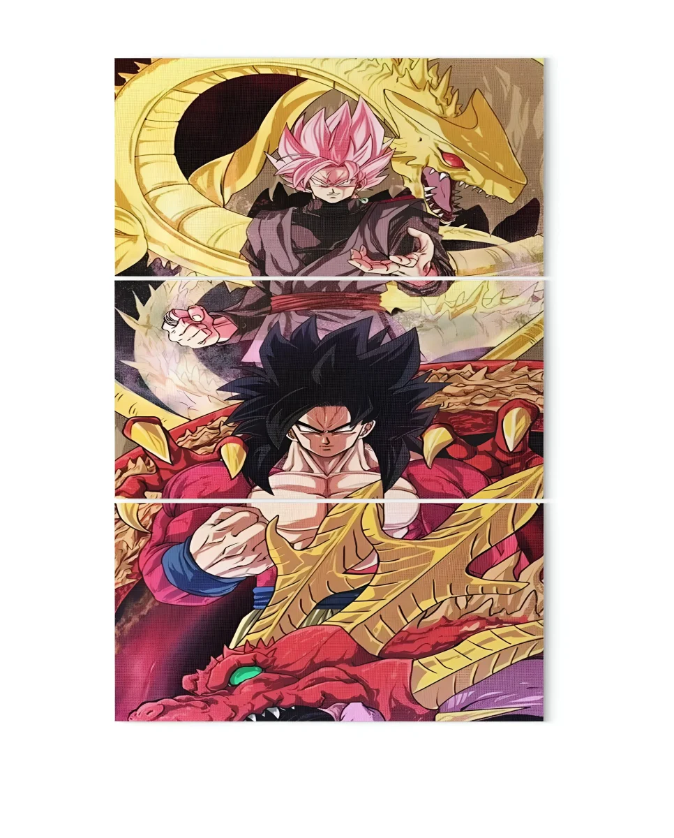 Les détails minutieux des transformations et des auras des personnages sont rendus avec une précision saisissante, offrant une immersion totale dans l’univers de Dragon Ball. Les couleurs vives renforcent l’intensité de la scène, tandis que la composition en trois parties donne une dimension dynamique à l’ensemble. L’arrière-plan, orné de détails rappelant l’univers de la série, ajoute une touche finale à cette pièce de collection incontournable pour tout fan.