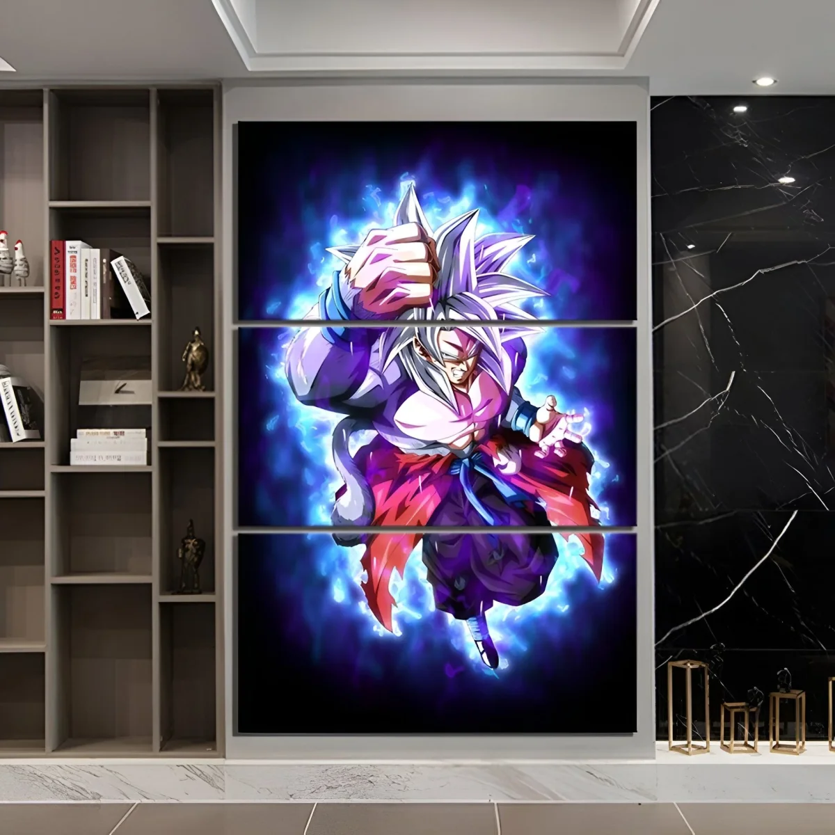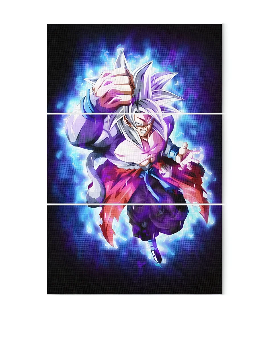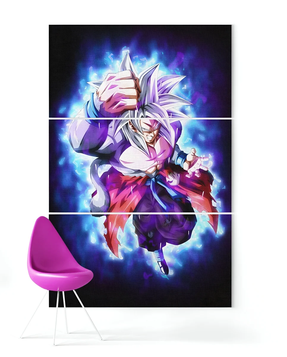 Le choix des couleurs dans ce tableau n’est pas anodin : le bleu intense de l’aura de Goku crée un contraste saisissant avec le violet de son pantalon et le rouge de son manteau, accentuant l’impression de puissance. La composition en trois panneaux permet de créer une œuvre d’art dynamique, donnant l’impression que Goku est en mouvement, prêt à bondir hors du cadre. Le niveau de détail est tel que l’on peut presque ressentir l’énergie qui émane du personnage, faisant de cette pièce un véritable hommage à l’univers Dragon Ball.