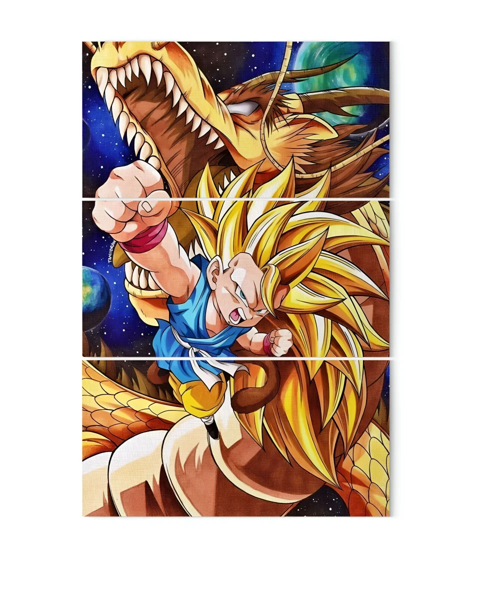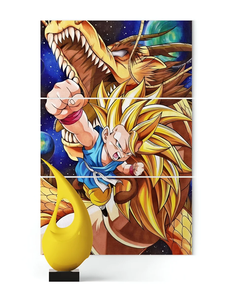 Shenron, le dragon majestueux, est représenté dans toute sa splendeur, avec ses écailles dorées et son regard perçant. Sa présence imposante témoigne de sa nature divine, capable d’exaucer les vœux. Le contraste entre la figure du dragon et celle de Goku renforce l’aspect surnaturel de cet univers, un mélange de combats et de divinités. Le tableau offre une immersion dans le monde mystique de Dragon Ball, où la magie et la puissance s’entremêlent.