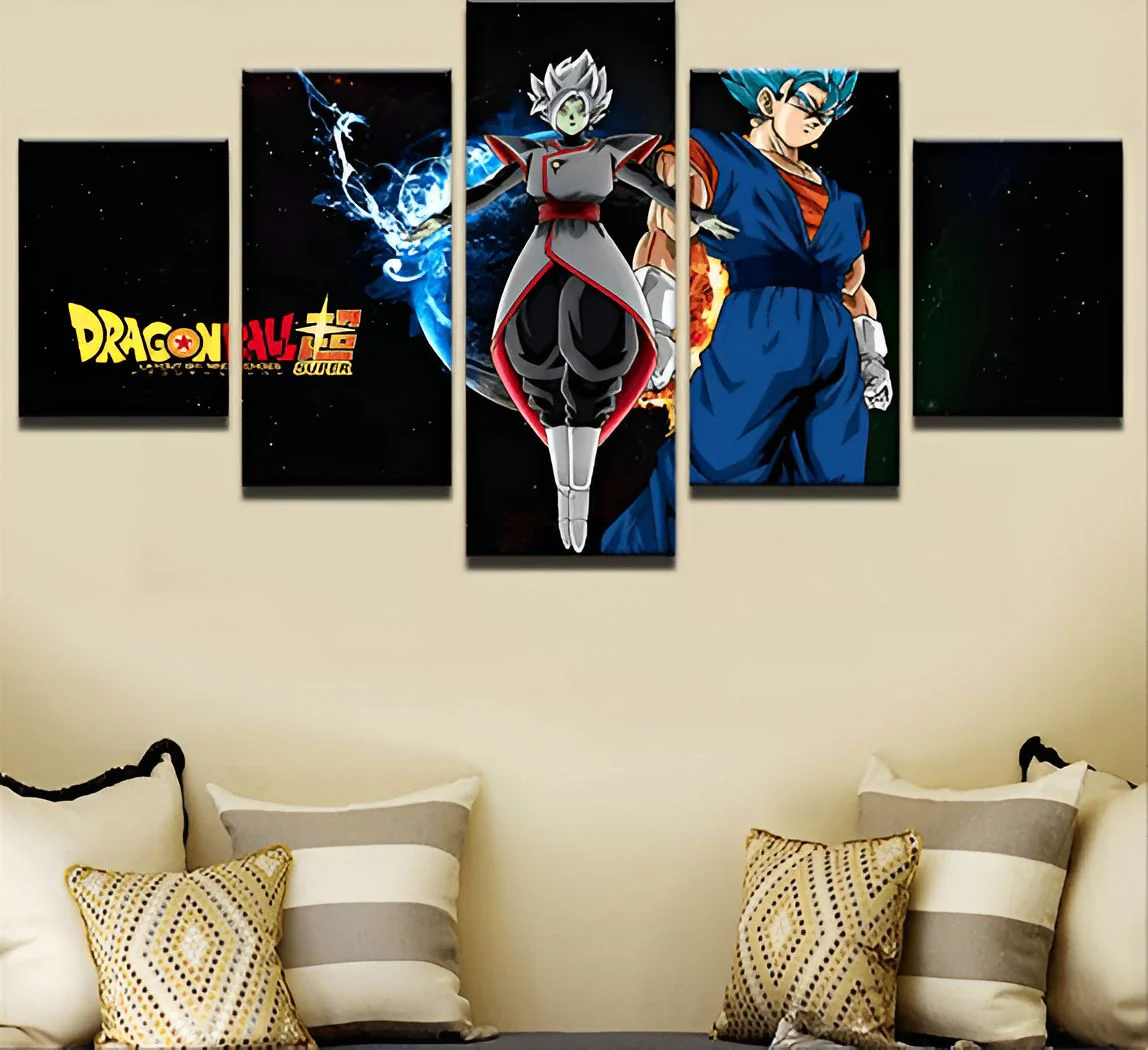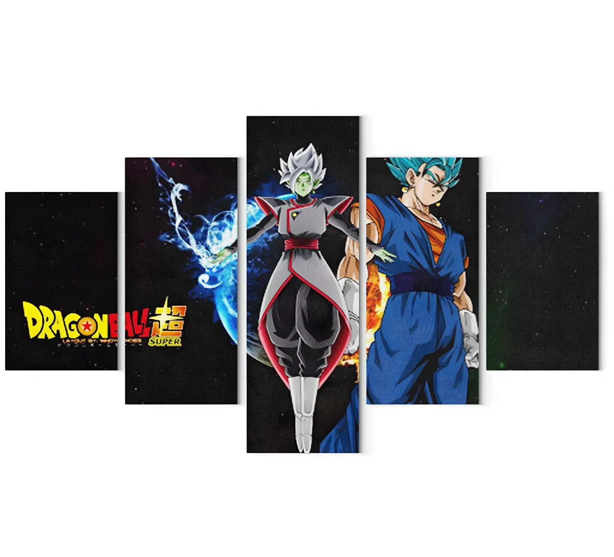 Le tableau, avec sa conception en cinq panneaux, offre une dimension panoramique à cette scène de Dragon Ball Super. La disposition des personnages, ainsi que le soin apporté aux détails, invitent le spectateur à se plonger dans l’univers de la saga. Chaque panneau contribue à raconter cette histoire, capturant l’essence de l’affrontement entre ces titans.