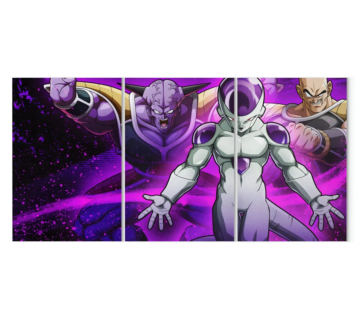 Ce tableau met en avant la présence charismatique de Freezer, le maître de l’Empire du Froid. Il se tient au centre, les bras écartés, comme s’il défiait quiconque oserait se dresser sur son chemin. Sa pose iconique, associée à son regard glacial, évoque la froideur et la cruauté qui le caractérisent si bien. Autour de lui, Dodoria et Zarbon apportent une touche de puissance brute et de menace sourde, renforçant ainsi l’impression de force et de domination émanant de cette composition. Le fond violet profond, constellé d’éclats d’énergie, intensifie l’aura maléfique de l’ensemble.