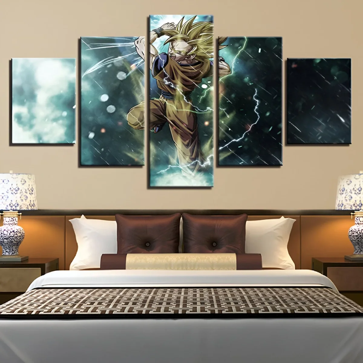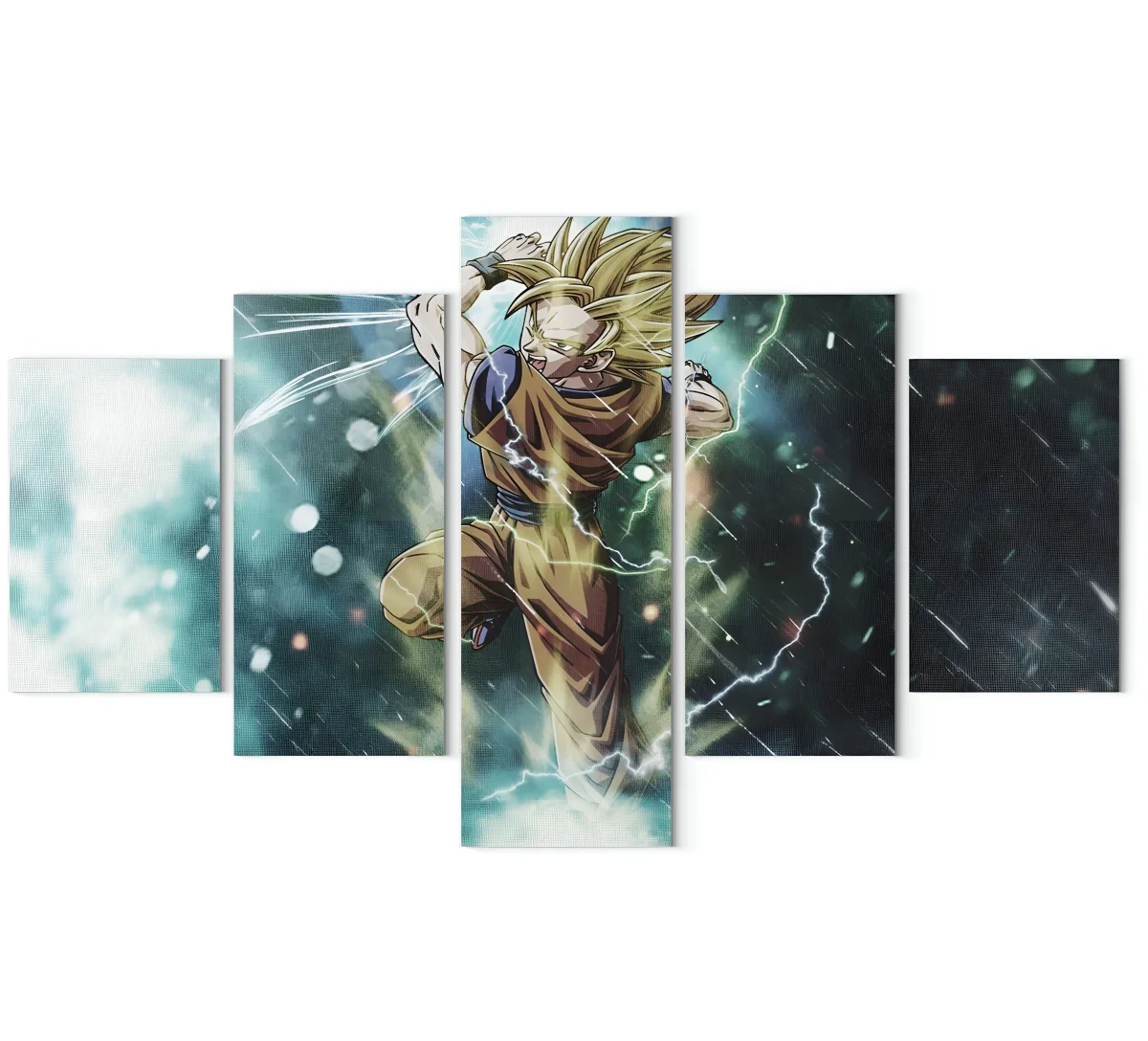 Ce tableau, composé de cinq toiles, dépeint Goku lors de sa transformation en Super Saiyan, un moment iconique de la saga Dragon Ball Z. La posture dynamique de Goku, associée aux éclairs qui l’entourent, transmet une impression de puissance brute et de détermination sans faille. Les couleurs vives et les effets lumineux permettent de recréer l’ambiance électrisante d’un combat acharné. Chaque panneau s’assemble harmonieusement pour former une scène épique, où l’on ressent toute l’énergie du guerrier Saiyan.