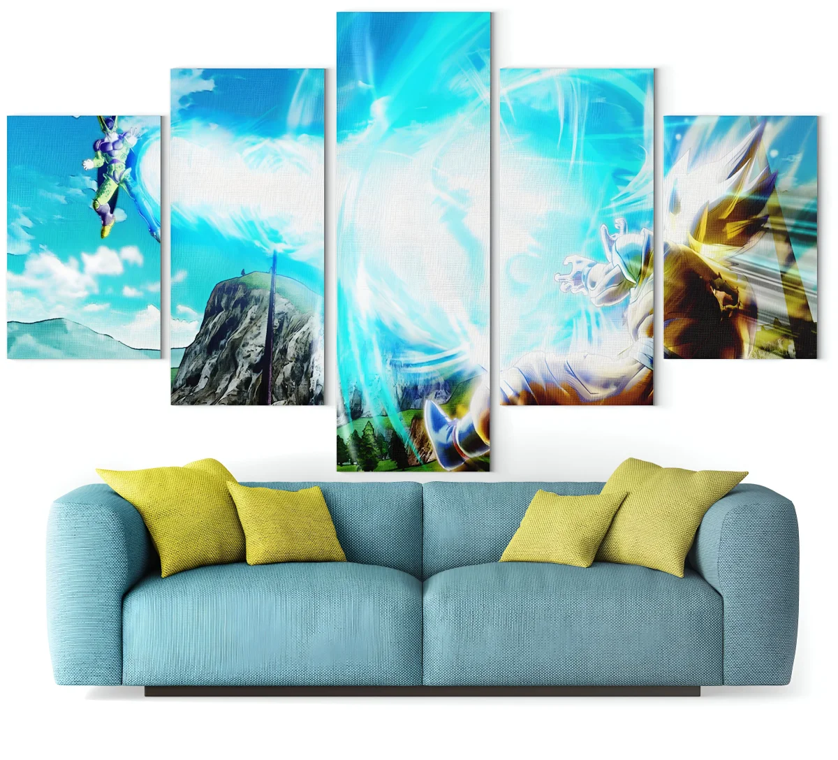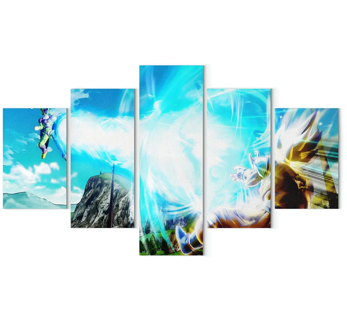 Le tableau est conçu pour retranscrire avec force le moment précis où Goku déchaîne son Kamehameha contre Cell. La disposition en cinq panneaux crée un effet panoramique qui met en valeur la puissance de la technique de Goku, tandis que Cell, légèrement en retrait, ajoute une touche de tension. Le traitement des couleurs vives et les effets visuels dynamiques accentuent l’impression d’un affrontement épique, comme si le salon devenait le théâtre de cette bataille légendaire. L’esthétique globale est fidèle à l’esprit de la série, avec ses lignes claires et son énergie débordante. Chaque détail est conçu pour immerger le spectateur dans l’univers de Dragon Ball Z.